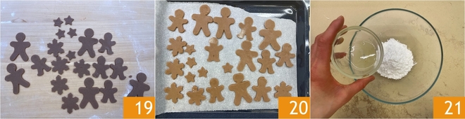 Also, create other shapes as desired, such as snowflakes and stars, using cookie cutters of different sizes 19. Transfer the cookies to a baking sheet lined with parchment paper 20 and bake in a static oven at 350°F for 10-12 minutes. While the cookies bake, prepare the royal icing by pouring the icing sugar and egg white into a bowl 21.