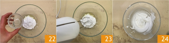 Add a few drops of lemon 22 and turn on the electric beaters 23 until you get a white, shiny, and compact cream 34; it will take about 5-10 minutes.