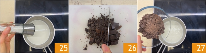 Move on to the ganache: in a saucepan, heat the cream with a pinch of salt 25. Coarsely chop the dark chocolate 26 and add it to the hot cream as soon as it reaches a boil 27.