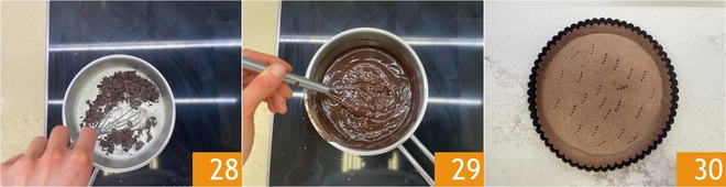 Stir with a whisk until the chocolate is completely melted and the ganache is smooth and velvety 28. Now recover the tart base that has cooled 30.