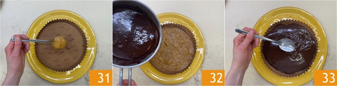Fill the shortcrust shell with the jam 31, leveling it with a spoon. Pour the hot ganache on top 32, letting it drip and then gently leveling it 33.