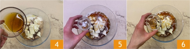 Also, add the honey 4, baking soda 5, and nutmeg 6.