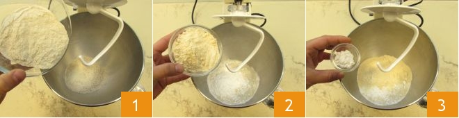To prepare gluten-free cookies, take a stand mixer with a dough hook (alternatively, you can make the dough by hand, quickly working all the cold ingredients in the indicated order) and pour in the buckwheat flour, the brown rice flour 1, potato starch, coconut flour 2, baking powder 3,
