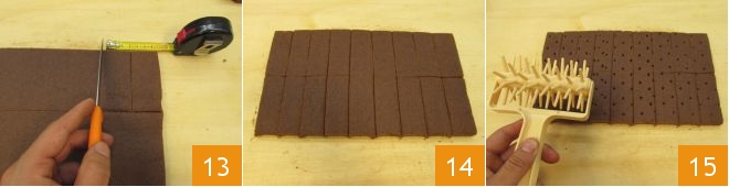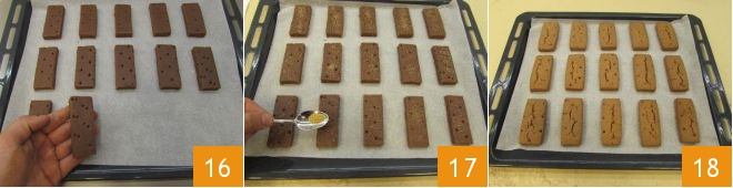 Using a smooth-edged knife, cut the rectangle in half lengthwise, then cut smaller rectangles about 1.2 inches wide and 3.1 inches long 13: with these quantities, you should obtain 18 cookies 14. Now make holes on the surface using a cookie cutter or the prongs of a fork 15.