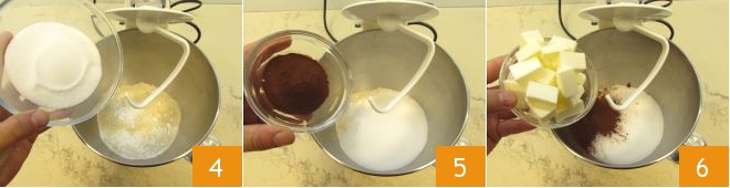 sugar 4, unsweetened cocoa powder 5, and the butter cut into pieces 6.