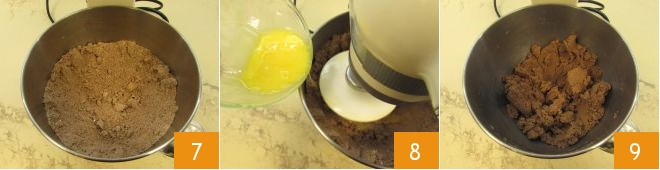 Set the stand mixer to medium speed and mix everything until you get a sandy texture 7. At this point, keeping the mixer running, gradually pour the eggs into the bowl 8 and continue mixing until fully incorporated into the mixture 9.