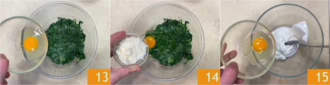 When the chard has cooled, transfer it to a bowl with the egg 13, grated cheese 14, and a pinch of salt. Separately, mix the ricotta, which you have drained in a sieve if necessary, with the eggs 15.