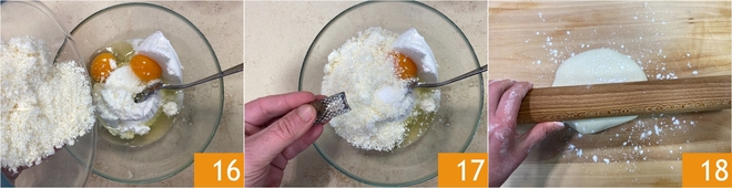 Season with grated cheese 16, nutmeg 17, and salt. Mix everything and set aside. At this point, take the dough from the fridge and roll it out with a rolling pin, dusting with a little gluten-free flour 18.