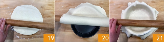 Form a disc with a diameter of about 12 inches 19 and roll the sheet onto the rolling pin. Unroll the sheet over a flared tin that measures 8 inches at the base and 9.5 inches at the rim, about 2 inches high 20. Pass the rolling pin over the rim to cut off the excess dough 21, which will need to be worked and rolled out again for the top layer.