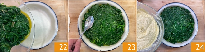 Now pour the chard filling into the tin 22 and level it well with the back of a spoon 23, then add the ricotta filling 34.