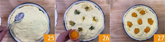 Level here too to have a smooth surface 25. Make 7 depressions with a spoon 26, shell the eggs separately and gently place them in these spaces 27, being careful not to break them.