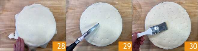 Roll out the rest of the shortcrust pastry, place it over the tin, and seal the edges 28. With the tip of a knife, make holes across the surface to let air escape during baking 29. Finally, brush the surface with the mixed egg yolk and cream 30.