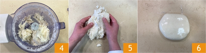 When the water is well absorbed 4, transfer the dough to the work surface 5. Knead lightly with your hands 5 just enough to compact it into a ball. Cover with plastic wrap 6 and transfer to the refrigerator while you prepare the filling.