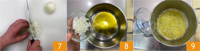 Peel and finely chop the onion 7. In a large pan, heat a drizzle of oil, then add the chopped onion 8 and stew over medium-low heat for about 8-10 minutes, adding a little water 9.