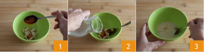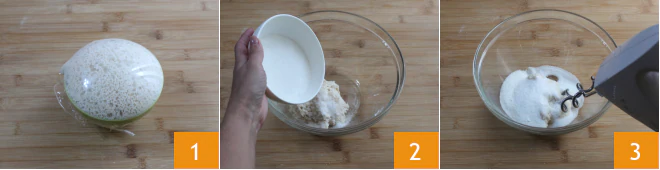 To prepare the gluten-free panettone, start with the starter: in a bowl crumble the fresh yeast, add the rice malt 1 and half the amount of warm water 2. Then stir with a spoon 3.