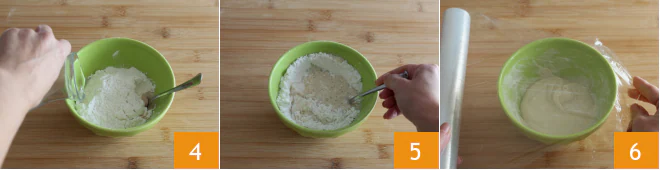 As soon as the yeast has dissolved, add the flour and the remaining warm water 4. Stir 5 until fully absorbed to obtain a smooth batter without lumps. Cover with plastic wrap 6 and let it rise for an hour at a temperature of about 79°F.