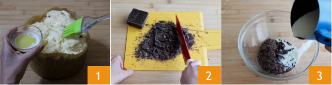 After 2 hours, take the mold which will have reached the edge, remove the plastic wrap and brush with warm melted butter 1. Bake in a preheated convection oven at 356°F: for the first 15 minutes place it on the lowest shelf of the oven. Then quickly open the oven to cover with a sheet of aluminum foil; continue baking for another 35 minutes. Check from time to time (without opening the oven anymore) and before taking it out, perform the toothpick test to verify it is cooked. Turn off the oven and wait 10 minutes before removing it. Then, take it out of the oven and let it cool on a wire rack. In the meantime, prepare the topping: pour the cream into a saucepan and bring it to just below boiling. Chop the dark chocolate 2, place it in a small bowl, and pour the hot cream over it 3.