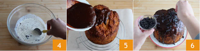 Stir quickly until the chocolate has completely melted 4. Pour the mixture over the surface of the panettone, spreading it delicately with a spatula 5 and letting it drip down the sides. Sprinkle with dark chocolate flakes 6 and serve your gluten-free panettone.