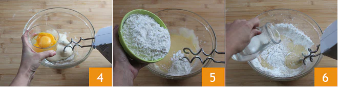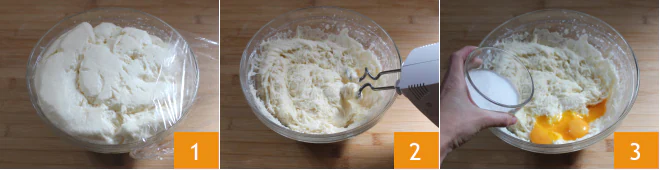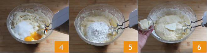 Take the dough again 1 and work with the beaters at low speed to deflate it 2. Then add 1/4 cup of sugar and the egg yolks 3.