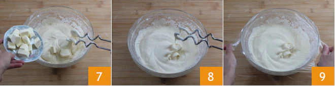 Continue kneading 4. Also add 1/2 cup flour 5 and continue working with the electric beaters until fully absorbed. Finally, add 1 1/2 tbsp of butter in pieces, always a little at a time 6.
