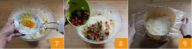 Once absorbed, flavor with lemon and orange zest 7 and, after 5 minutes, add the candied fruit 8, continuing to knead for at least 10 minutes. Evenly distribute the dough in a 750 g panettone mold, cover with plastic wrap 9 and let rise in the oven with the light on for at least 2 hours: the dough should reach the edge of the mold.