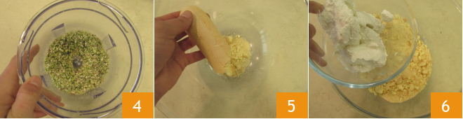 To make the gluten-free truffles with ricotta and chocolate, first finely chop the dark chocolate with a knife 1. In a food processor, add the pistachios 2 and almonds 3.