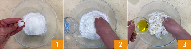 To prepare the gluten-free savory pie with spinach and tofu, start with the base. In a bowl, put the rice flour and add the salt 1. Gradually pour in the water and knead 2. Finally, add the oil 3.