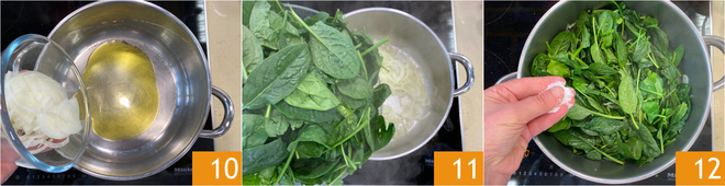 In a pot, pour a drizzle of oil, add the onion 10, and stew over medium-low heat for 4-5 minutes. Add the spinach 11, season with salt 12, and cook for 5-6 minutes, stirring occasionally. Turn off the heat and let cool.