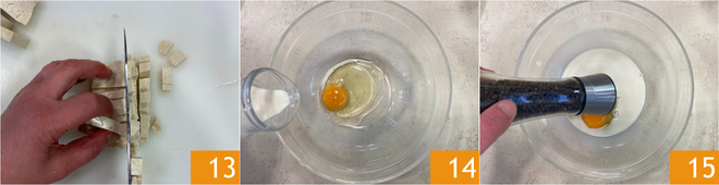 Meanwhile, dice the tofu 13. In a bowl, crack an egg, add the soy milk 14, and season with salt and pepper 15.