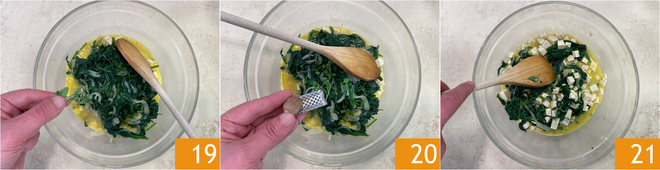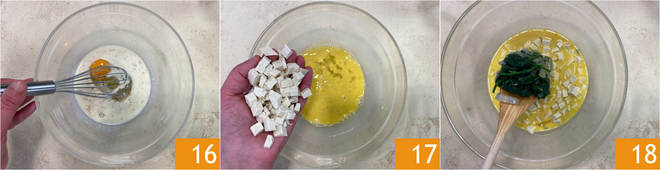 Mix with a whisk 16 until you get a homogeneous mixture. Add the tofu 17 and spinach 18.
