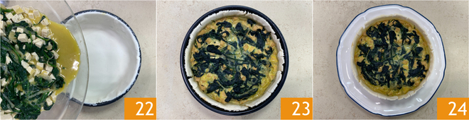 Pour everything into the pan 22 and level. Bake in a static oven at 350°F for 60 minutes, on the lowest rack of the oven 23. Let it cool slightly, unmold, and serve. Your gluten-free savory pie with spinach and tofu is ready to enjoy 34!