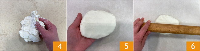 Once the oil is absorbed into the flour, move to your work surface 4 and continue kneading until you obtain a compact dough 5. Place the dough on a sheet of parchment paper and, using a rolling pin 6, roll out a circular sheet with a diameter of 12 inches and about 1/8 inch thick.