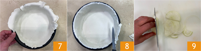 Place the dough inside an 8-inch pan 7, then trim off the excess edges 8. Let the base rest in the refrigerator until ready to use. Now move on to the filling and start by slicing the onion 9.