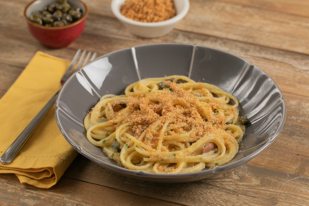The yellow tomatoes create an enveloping and velvety cream, capable of perfectly binding the spaghetti, which contrasts with the savory taste of the capers and anchovies. The crunchy touch is given by the toasted breadcrumbs, which adds an irresistible rustic note.