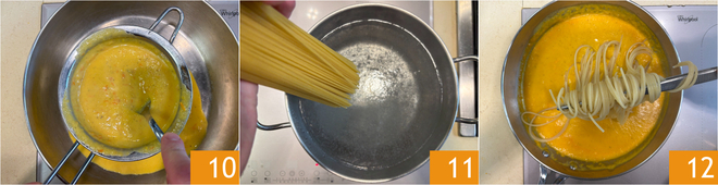 To make it even smoother, strain it through a sieve into a pan 10. At this point, cook the spaghetti in plenty of salted water 11 and drain it directly into the pan 12.