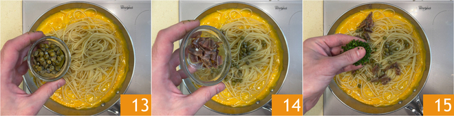 Add the capers 13, chopped anchovies 14, and chopped parsley 15.