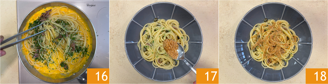 Mix 16, plate up and garnish with the toasted breadcrumbs 17. Your gluten-free spaghetti with yellow cherry tomato sauce, capers, and anchovies is ready to be served 18!