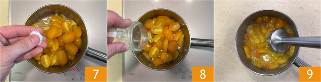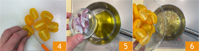 Cut the cherry tomatoes in half 4 and slice the shallot. In a pan, heat the oil 5, add the shallot and let it turn golden for a few minutes. Then add the cherry tomatoes 6.
