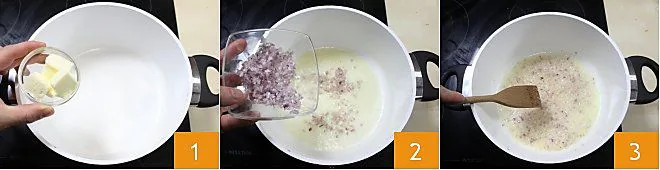 First, prepare the pea cream: finely chop the shallot and heat the butter in a large saucepan 1, add the chopped shallot 2 and let it sauté for a couple of minutes 3;