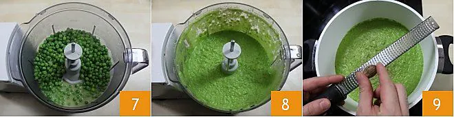 Transfer the cooked peas 7 to a blender cup and blend until a smooth mixture is obtained 8. If desired, you can also strain the cream through a fine-mesh sieve to remove any pea skin residues. Return the pea cream thus obtained to a saucepan and add the nutmeg 9,