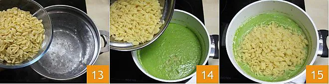 Meanwhile, bring plenty of salted water to a boil and cook the gnocchetti 13 for the time indicated on the package; drain them al dente and quickly toss them in the saucepan with the cream (14-15). Adjust the salt if necessary and serve the gnocchetti with pea cream piping hot.