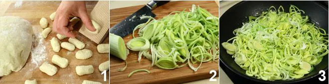 Prepare the potato gnocchi (click Potato gnocchi to see the recipe) and let them rest in a cool place covered with a lightly floured cloth 1. Meanwhile, prepare the sauce that will be used to dress the gnocchi, starting by slicing the leek into thin rounds 2 and wilting it over low heat in a large pan with the already hot oil and butter 3.