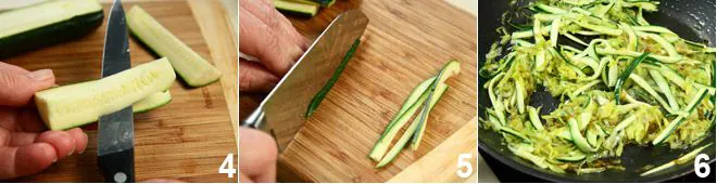 Then cut the zucchini, removing the central part 4, and slice them into julienne strips 5. Add them to the pan with the wilted leek and let them cook 6.