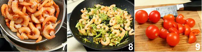 In the meantime, boil the shrimp in boiling water for about three to four minutes, drain them, and shell them. Add them to the leek and zucchini in the pan 8. Cut the cherry tomatoes into wedges 9 and add them to the pan. As soon as they start to soften, add the tomato puree and let it cook for another five minutes 10.