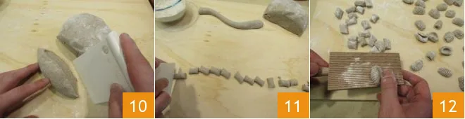 Now take the dough that you left to rest covered with plastic wrap. Lightly sprinkle it with flour to facilitate handling. Take a piece of dough 10. For each piece, form a stick about 1/2 inch (1 cm) thick and cut it into small pieces of the same size 11. Give each piece the classic gnocchi ridges using a wooden board or with the help of a fork 12. Alternatively, press each piece with your fingertip to create a small indentation in the center. Repeat this operation for each piece of gnocchi obtained.