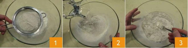 To prepare the gnocchi alla bava, start by sifting the all-purpose flour into a bowl. Then also sift the buckwheat flour into the same bowl 2. Add the water at room temperature to the flours. Using a fork, mix the flours with the water 3. Season with salt.