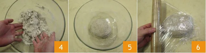 Continue mixing until the ingredients are combined, then knead the dough vigorously with your hands 4 until you get a smooth and homogeneous dough with a soft but compact consistency. Form the dough into a ball 5. Cover the ball with plastic wrap 6 and let it rest for at least 1 hour in a cool place at room temperature.