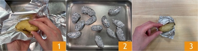 To prepare gnocchi with mushrooms and provola, wrap the Ratte potatoes in aluminum foil 1, place them on a baking tray 2, and bake in a preheated static oven at 392°F for about 40 minutes. Once cooked, remove the foil 3.