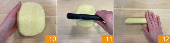 Form a compact dough 10, once ready, the dough does not require resting time and can be worked immediately. Divide it into smaller portions 11, then roll it into logs 12.