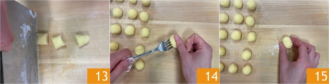 Cut them into small pieces of about 0.3 oz 13. Round each piece between the palms of your hands to form spheres, dusting your hands with rice starch for ease. If desired, you can slightly groove them with a fork 14 to give the classic gnocchi shape 15. Also, dust the prongs with starch to achieve a well-defined shape.